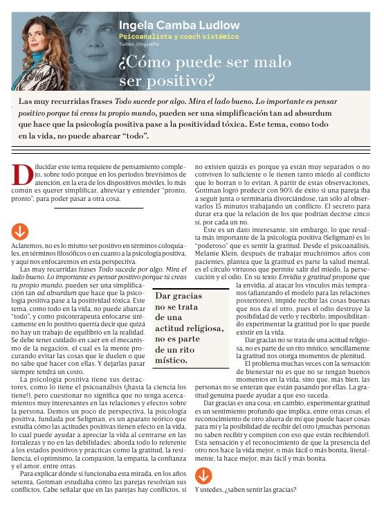 Las muy recurridas frases “Todo sucede por algo. Mira el lado bueno. Lo importante es pensar positivo porque tú creas tu propio mundo”, pueden ser una simplificación tan ad absurdum que hace que la psicología positiva pase a la positividad tóxica. Este tema, como todo en la vida, no puede abarcar “todo” (04/09/23)
