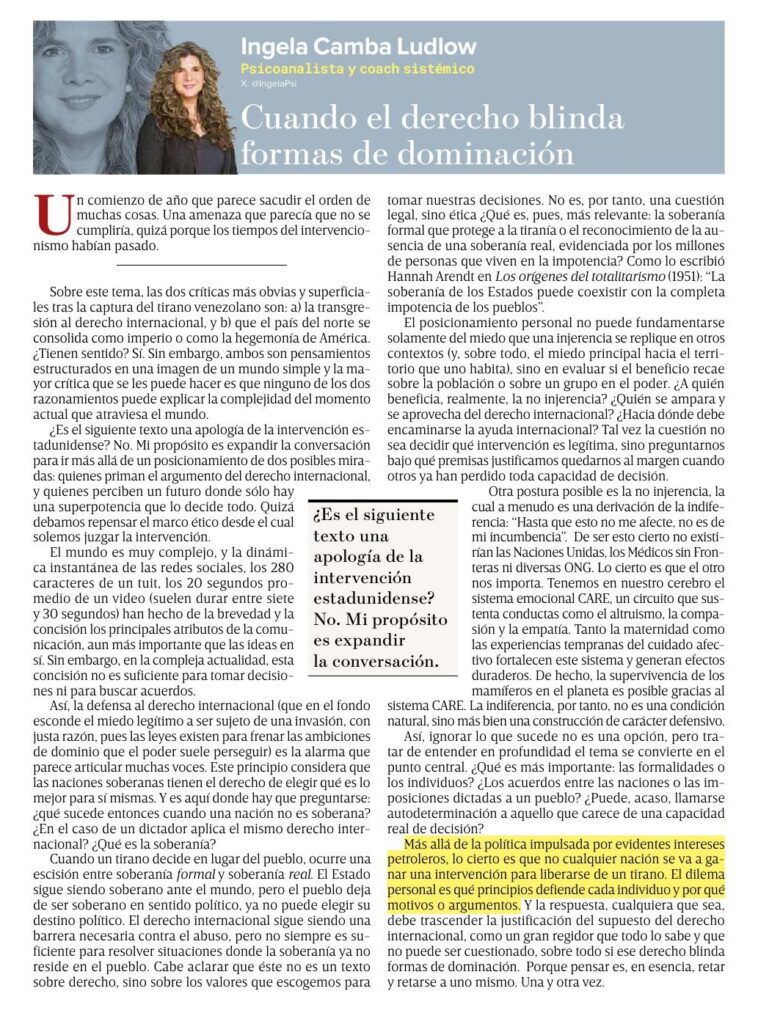 Cuando el derecho blinda formas de dominaciónpor Ingela Camba Ludlowen articulo de la semana, columnaen Publicado el 15/01/2026 Un comienzo de año que parece sacudir el orden de muchas cosas. Una amenaza que parecía que no se cumpliría, quizá porque los tiempos del intervencionismo habían pasado.