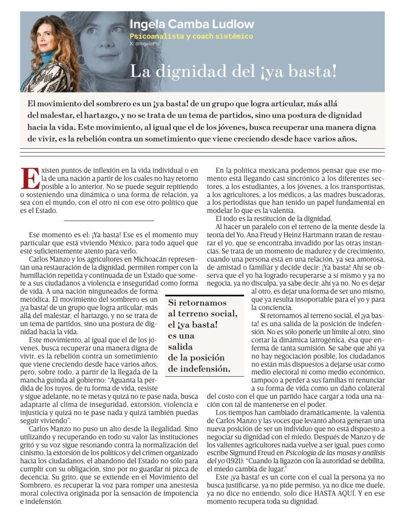 El movimiento del sombrero es un ¡ya basta! de un grupo que logra articular, más allá del malestar, el hartazgo, y no se trata de un tema de partidos, sino una postura de dignidad hacia la vida. Este movimiento, al igual que el de los jóvenes, busca recuperar una manera digna de vivir, es la rebelión contra un sometimiento que viene creciendo desde hace varios años.