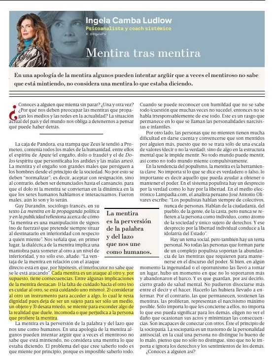 Mentira tras mentirapor Ingela Camba Ludlowen columnaen Publicado el 15/08/202515/08/2025 En una apología de la mentira algunos pueden intentar argüir que a veces el mentiroso no sabe que está mintiendo, no considera una mentira lo que estaba diciendo (08/01/24)