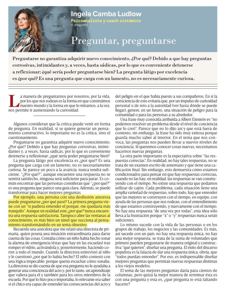 Preguntarse no garantiza adquirir nuevo conocimiento. ¿Por qué? Debido a que hay preguntas corrosivas, intimidantes y, a veces, hasta sádicas, por lo que es conveniente detenerse a reflexionar: ¿qué sería poder preguntarse bien? La pregunta látigo por excelencia es ¿por qué? Es una pregunta que carga con un lamento, no es necesariamente curiosa. (11/11/23)