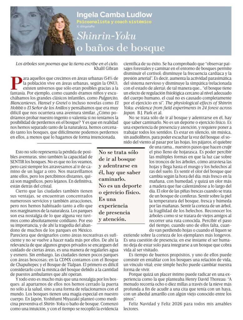 Shinrin-Yoku o baños de bosquepor Ingela Camba Ludlowen articulo de la semana, columnaen Publicado el 22/12/202522/12/2025 Es tiempo de buenos propósitos, y uno de ellos puede consistir en entablar con los bosques una relación de vida, un vínculo vital; este simple hecho puede cambiar nuestra forma de vivir.