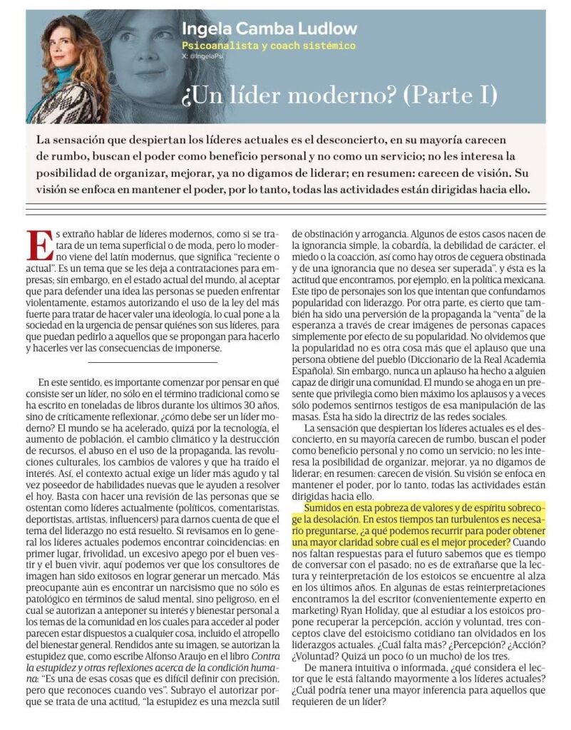 La sensación que despiertan los líderes actuales es el desconcierto, en su mayoría carecen de rumbo, buscan el poder como beneficio personal y no como un servicio; no les interesa la posibilidad de organizar, mejorar, ya no digamos de liderar; en resumen: carecen de visión. Su visión se enfoca en mantener el poder, por lo tanto, todas las actividades están dirigidas hacia ello. (19/08/24)