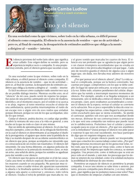 En una sociedad como la que vivimos, sobre todo en la vida urbana, es difícil pensar el silencio como compañía. El silencio es la ausencia de sonidos —que no de actividad—, pero es, al final de cuentas, la desaparición de estímulos auditivos que obliga a la mente a dirigirse al —sonido— interior. (21/08/23)